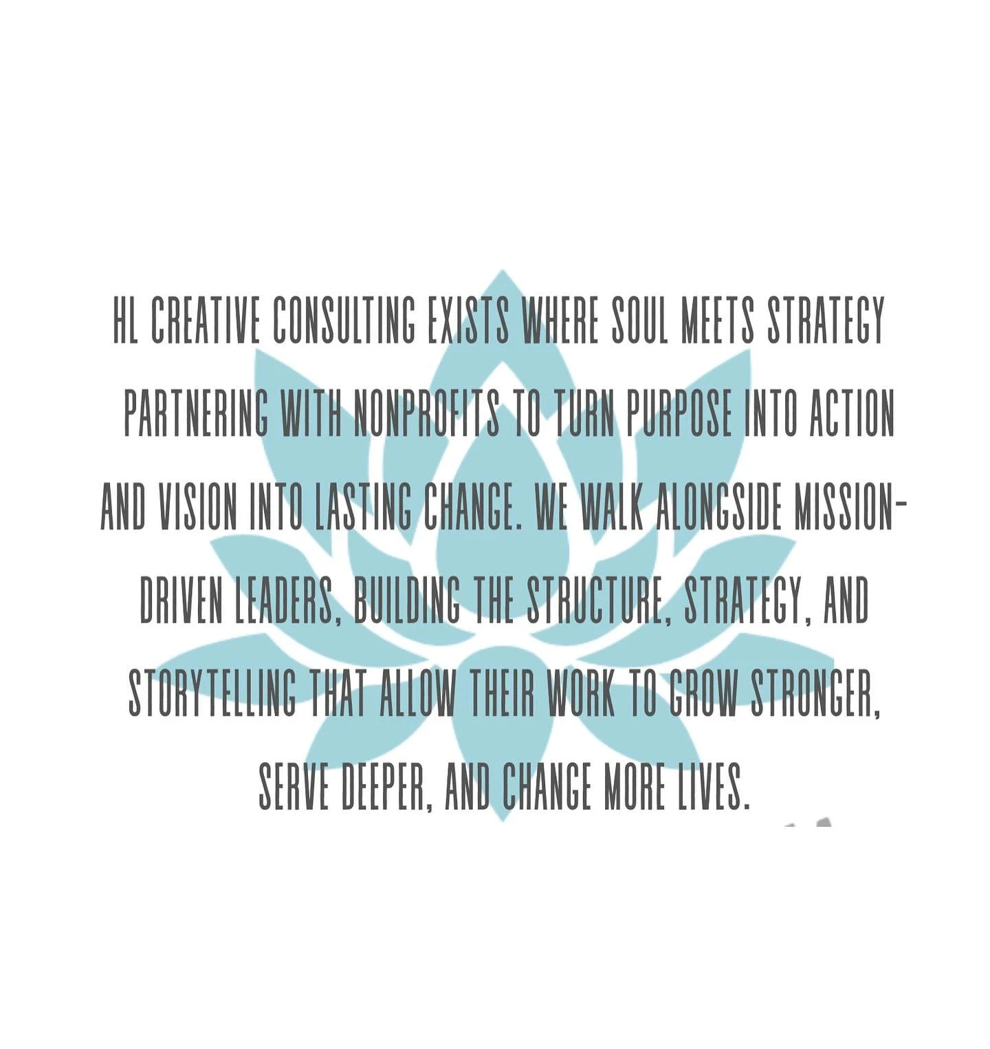 At HL Creative Consulting, we bridge the space between heart and strategy — helping nonprofits grow with purpose, integrity, and creativity. Our vision is a world where every mission has the structure, support, and storytelling it needs to thrive.